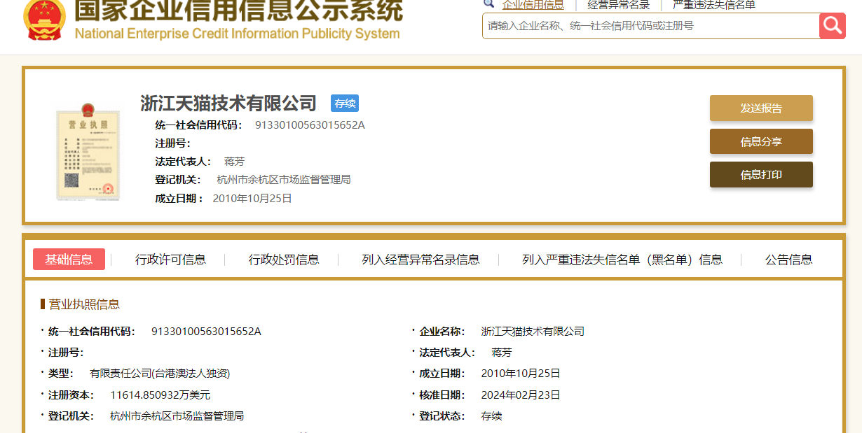 其中,汪海卸任浙江天猫技术有限公司法定代表人、董事长、经理,由蒋芳担任法定代表人、执行董事兼总经理,同时,公司注册资本由约1.14亿美元增至约1.16亿美元。