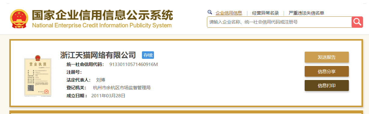 刘鹏卸任浙江天猫网络有限公司法定代表人、董事长、总经理,由刘博担任法定代表人、执行董事兼总经理。