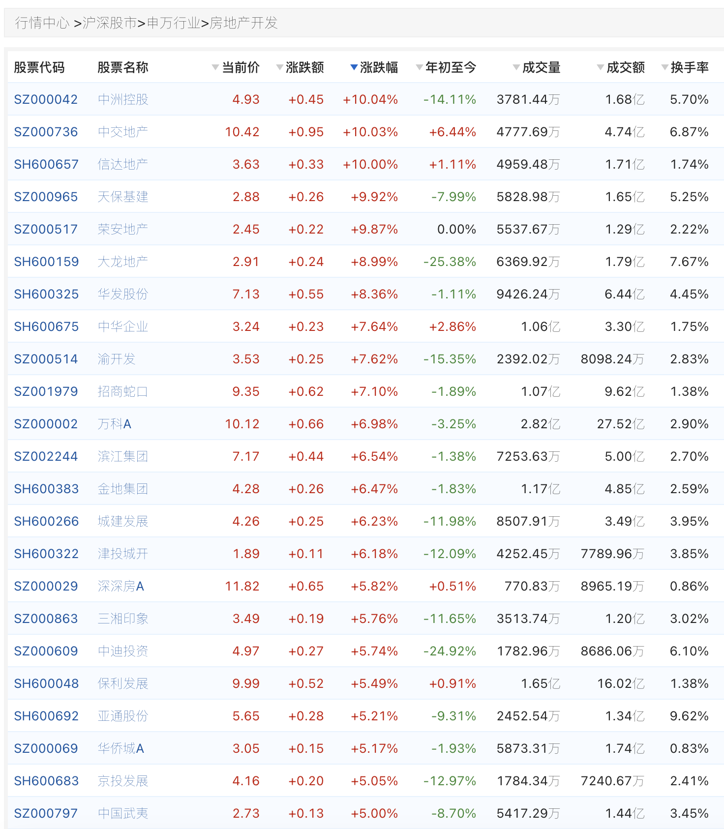 乐居财经 徐迪 3月12日,A股房地产开发板块午后异动,截至发稿,中洲控股、中交地产、信达地产等多只个股陆续涨停,华发股份、招商蛇口、万科等头部房企涨幅均超5%。