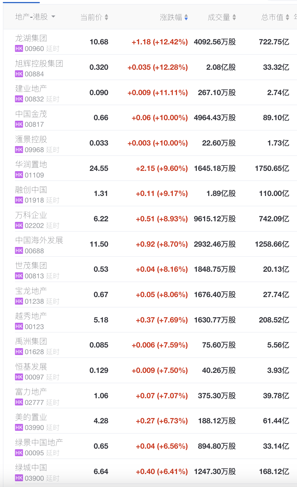 港股方面,龙湖集团、旭辉控股集团涨超12%,建业地产、中国金茂涨超10%,华润置地、融创中国、中国海外发展等纷纷大幅拉涨。