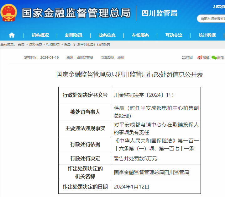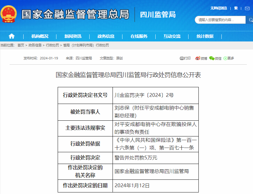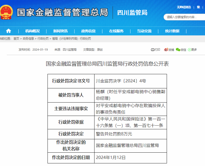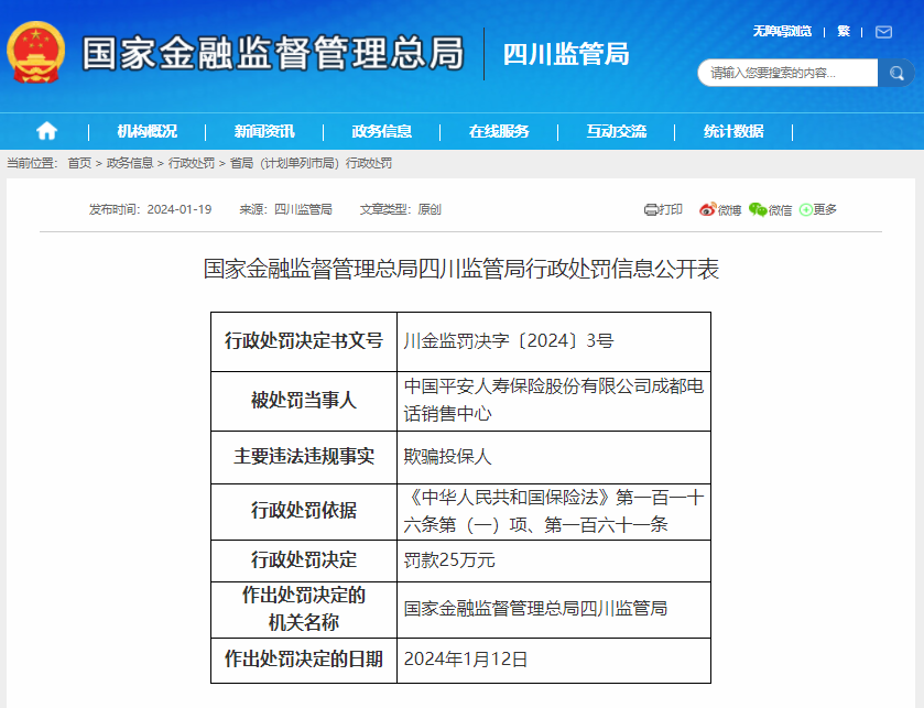 瑞财经 张林霞 3月14日消息,国家金融监督管理总局网站近日公布的行政处罚决定书(川金监罚决字〔2024〕3号)显示,因欺骗投保人,国家金融监督管理总局四川监管局作出行政处罚,对中国平安人寿保险股份有限公司成都电话销售中心罚款25万元。
