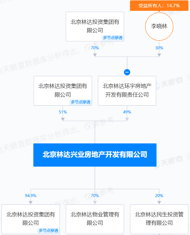 天眼查显示,林达集团的法定代表人为李晓林,由北京林达兴业房地产开发有限公司(简称“林达兴业”)和杭燕珍各持股94.9%和5.1%。