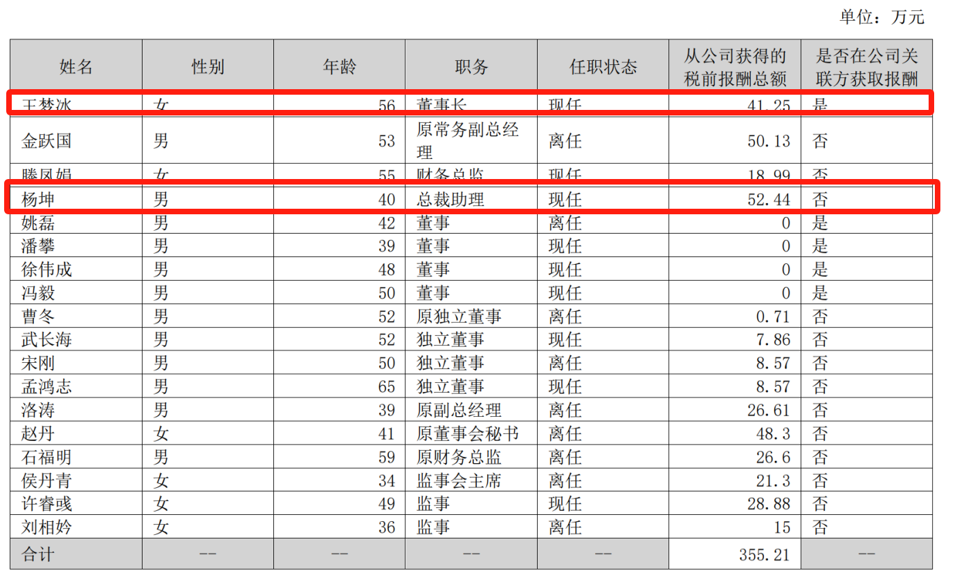 年报显示,董事长王梦冰2023年年薪为41.25万元,总裁助理杨坤年薪为52.44万元。