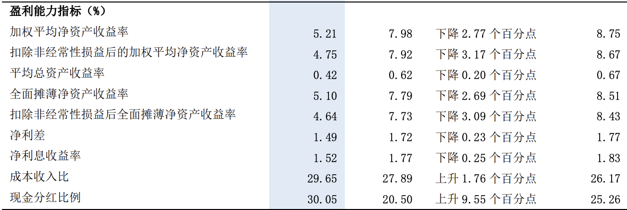 盈利指标上,加权平均净资产收益率5.21%,连续两年下降;净利差持续收窄至1.49%;成本收入比较上年上升1.76个百分点至29.65%。