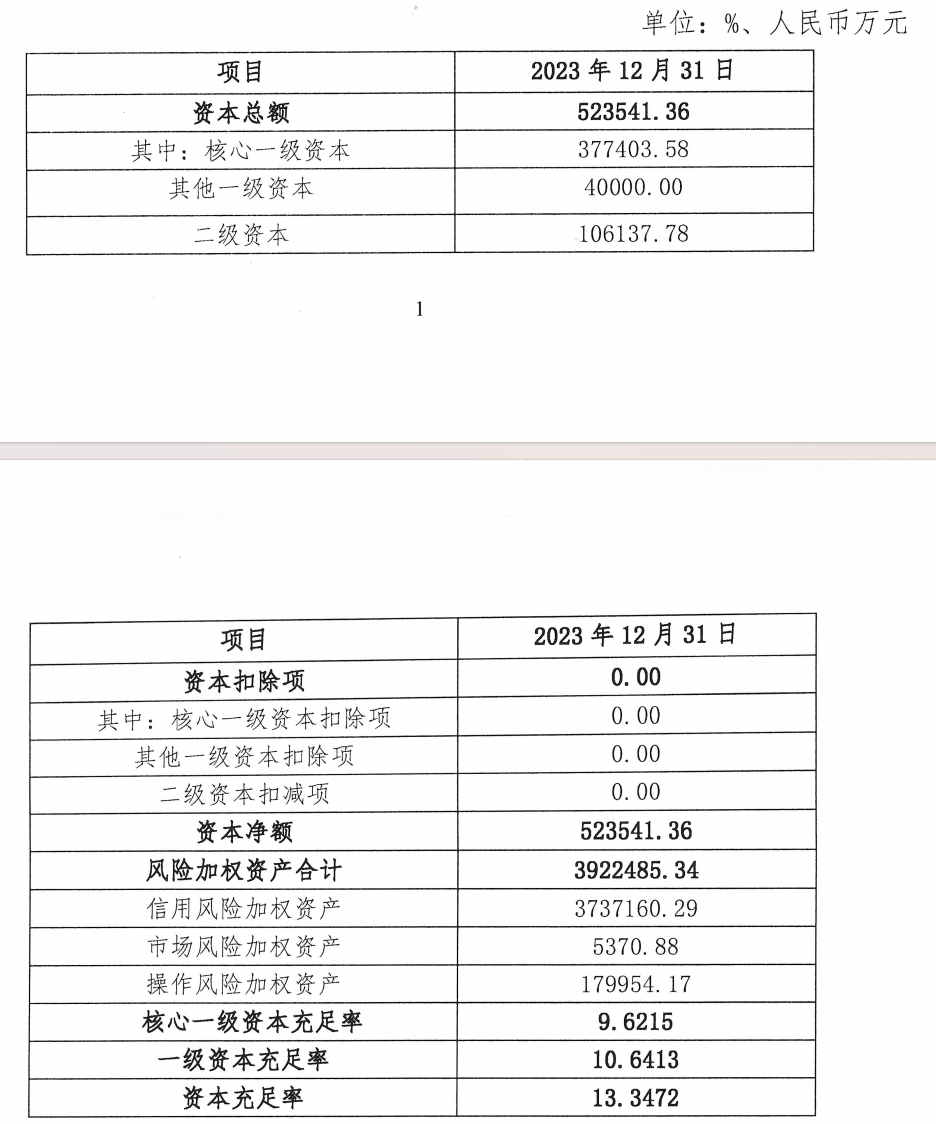 截至2023年12月末,金华成泰农商银行合并口径资本充足率13.3472%,一级资本充足率10.6413%,核心一级资本充足率9.6215%。