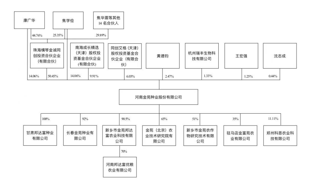 招股书显示,金苑种业控股股东为金诚同创,实际控制人为康广华,焦学俭。金诚同创持有金苑种业5152万股,持股比例50.45%,为金苑种业控股股东。