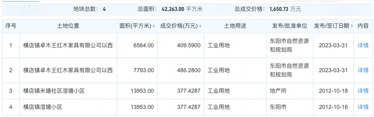 天眼查显示,卓木王家具有多条拿地信息,其中2023年3月底,该企业分别斥资486.28万和409.59万,在横店镇卓木王红木家具有限公司以西拿下2宗工业用地。