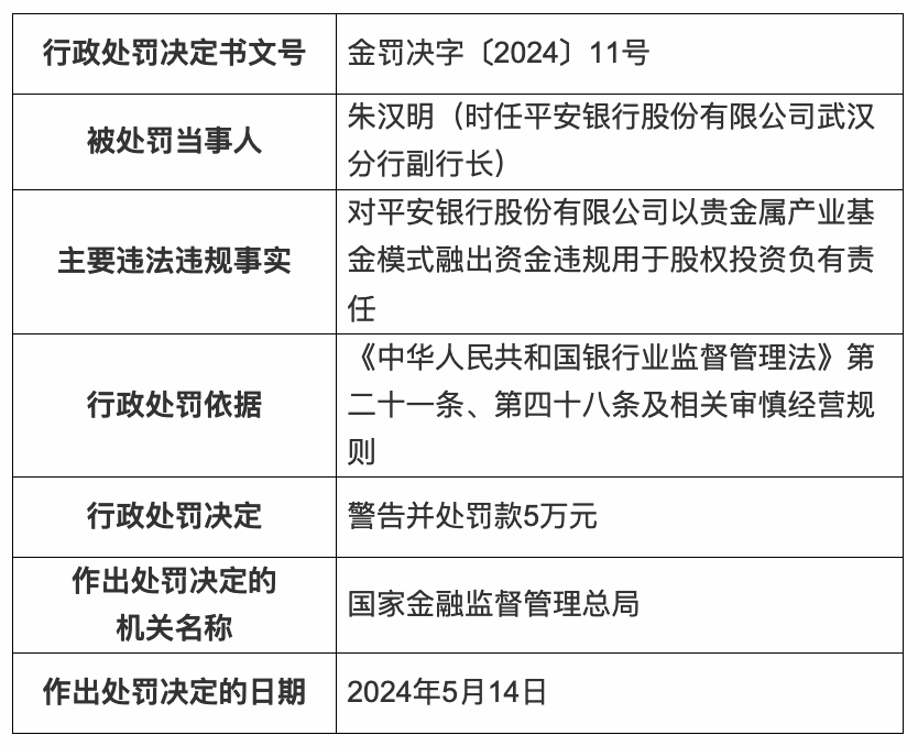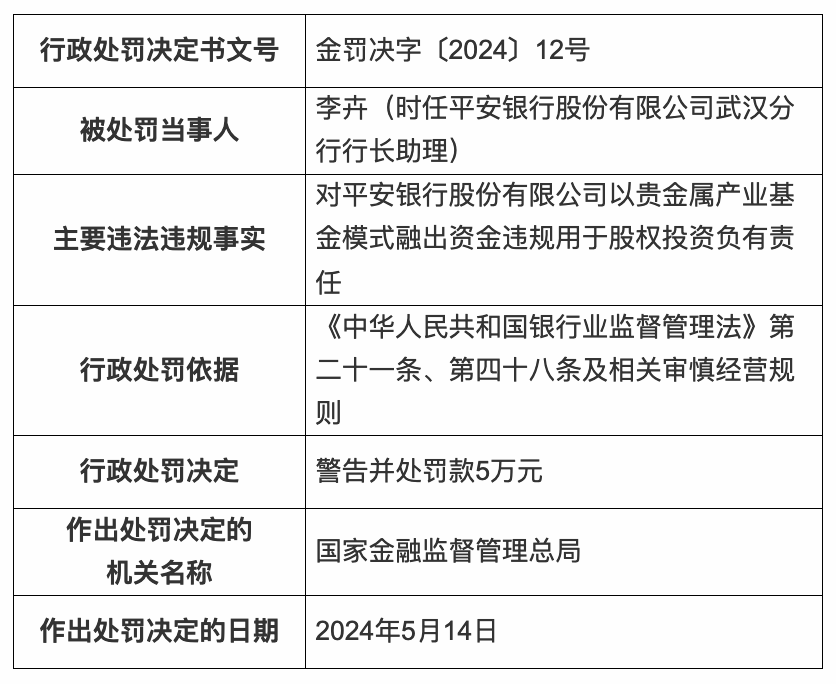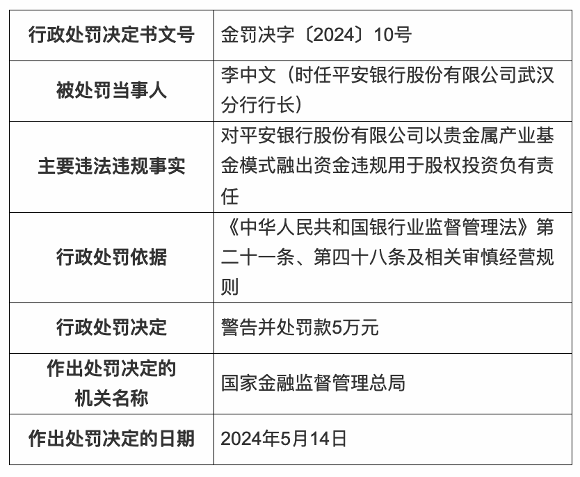 时任平安银行武汉分行行长李中文、副行长朱汉明、行长助理李卉对该行以贵金属产业基金模式融出资金违规用于股权投资负有责任,被警告并分别处罚款5万元。