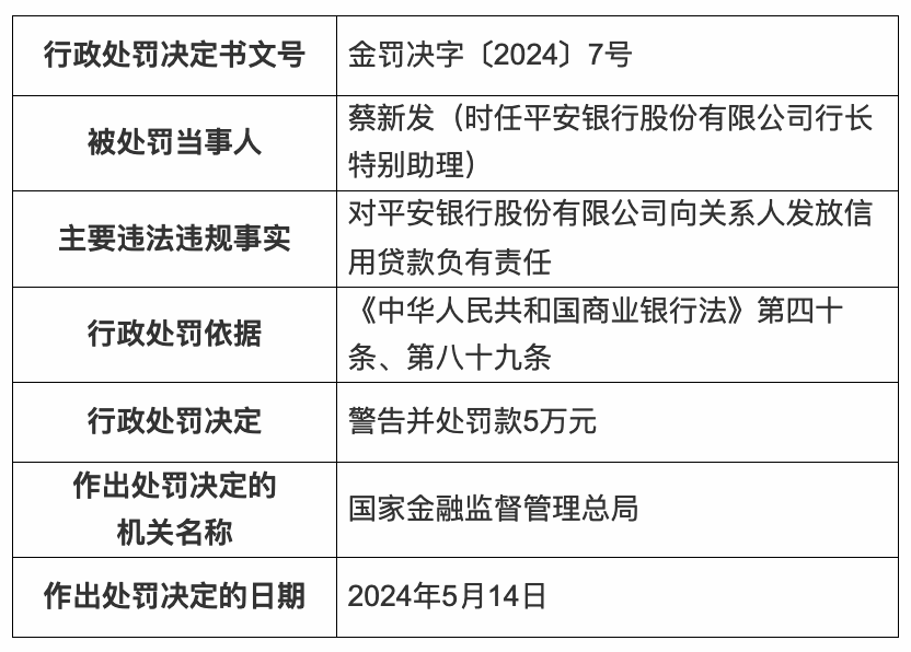 时任平安银行行长特别助理蔡新发对该行向关系人发放信用贷款负有责任,被警告并处罚款5万元;