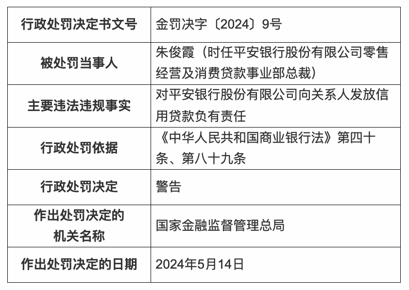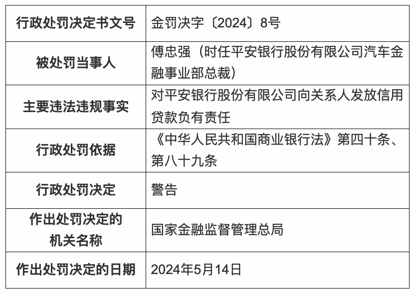 时任平安银行汽车金融事业部总裁傅忠强、零售经营及消费贷款事业部总裁朱俊霞对该行向关系人发放信用贷款负有责任,被警告;