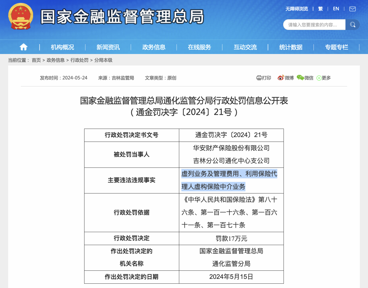 瑞财经 徐迪 5月23日,国家金融监督管理总局通化监管分局行政处罚信息公开表显示,华安财产保险股份有限公司吉林分公司通化中心支公司因虚列业务及管理费用、利用保险代理人虚构保险中介业务被罚款17万元。