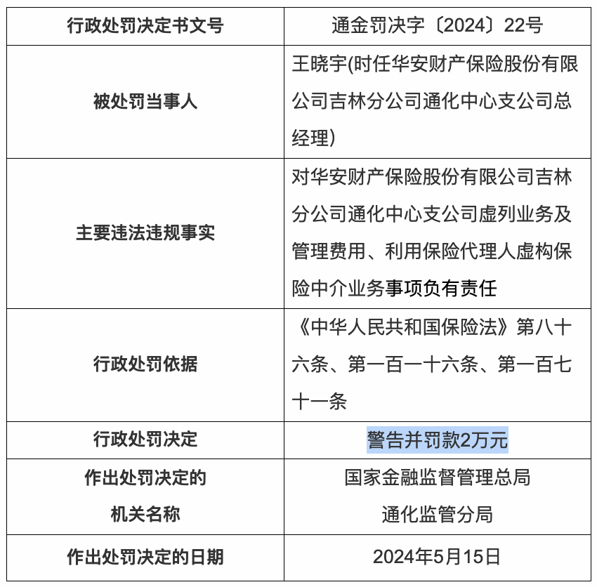 时任华安保险吉林分公司通化中心支公司总经理王晓宇因对上述事项负有责任,被警告并罚款2万元。
