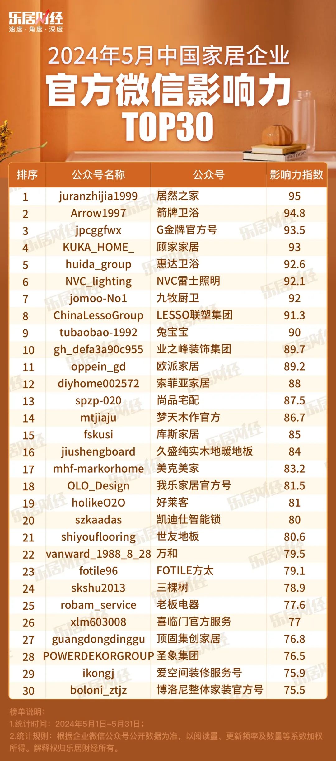 本期榜单,乐居财经共收集148家在5月份有更新的家居企业微信号作为样本,根据库内账号的多项公开数据,包括文章推送频次、总发文数量、总阅读量,以及单篇文章的爆文指数等系数加权得出影响力指数。