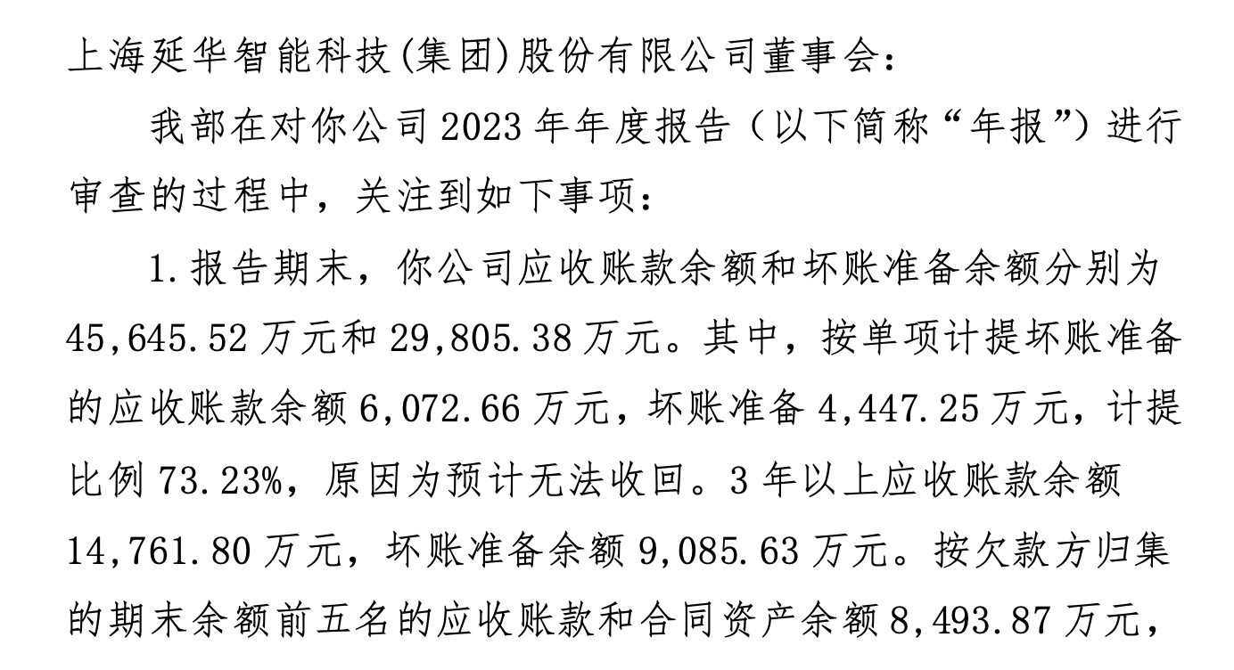 报告期末,延华智能的应收账款余额和坏账准备余额分别为4.56亿元和2.98亿元。其中,按单项计提坏账准备的应收账款余额6072.66万元,坏账准备4447.25万元,计提比例73.23%,原因为预计无法收回。3年以上应收账款余额1.48亿元,坏账准备余额9085.63万元。