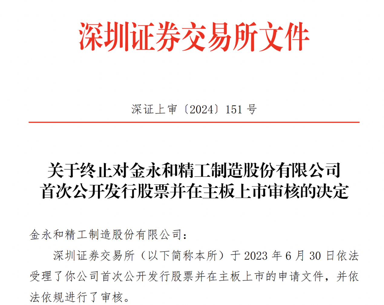 瑞财经 刘治颖 6月16日,深交所发布关于终止对金永和精工制造股份有限公司(以下简称:金永和)首次公开发行股票并在主板上市审核的决定。