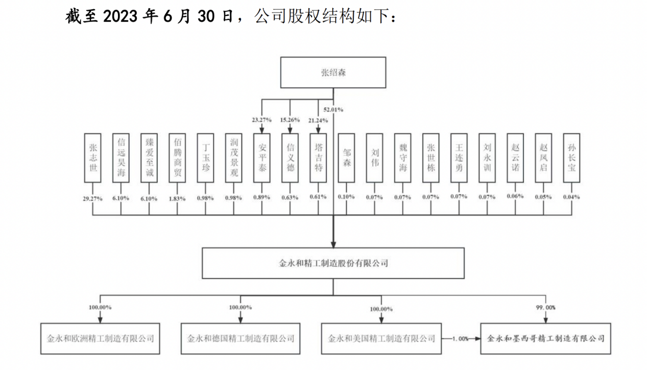 截至2023年6月30日,张绍森直接持有金永和4265万股股份,占本次发行前公司总股本的52.01%;分别通过员工持股平台安平泰、信义德、塔吉特3家员工持股平台,间接控制公司73万股股份、52万股股份和50万股股份,共计175万股股份,占本次发行前公司总股本的2.13%;合计持有公司4440万股股份,占本次发行前公司总股本的54.14%,为公司控股股东、实际控制人。