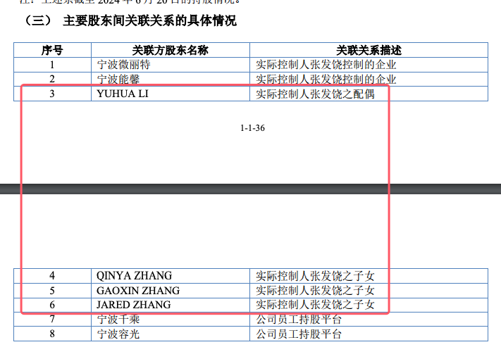 据瑞财经查阅,能之光实际控制人为张发饶,张发饶直接持有公司13.84%的股份,通过持有一致行动人宁波微丽特股权间接控制公司 26.46%股份,通过持有一致行动人宁波能馨间接控制公司 6.26%股份,通过一致行动人张发饶之配偶YUHUA LI、张发饶之子女 QINYA ZHANG、张发饶之子女GAOXIN ZHANG 及张发饶之子JARED ZHANG 分别控制公司 1.71%、0.95%、0.95%及 0.95%股份,可实际支配发行人股份表决权比例为51.13%。张发饶妻子YUHUA LI在公司任总经理助理。