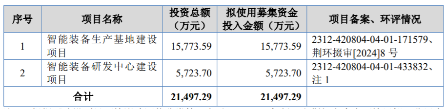 楚大智能本次IPO拟使用募集资金投入金额2.15亿元,其中,1.58亿元用于智能装备生产基地建设项目,0.57亿元用于智能装备研发中心建设项目。