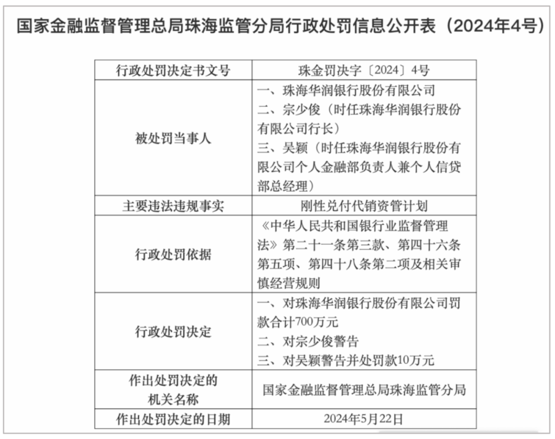 珠海华润银行分红缩水,宗少俊收到大罚单
