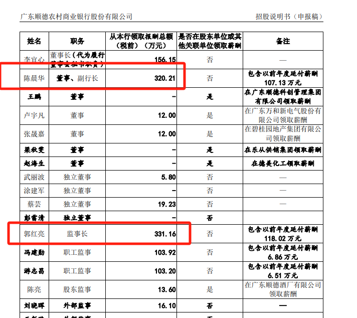 顺德农商行IPO:监事长郭红亮领薪331万远超董事长,普通员工人均年薪30万元