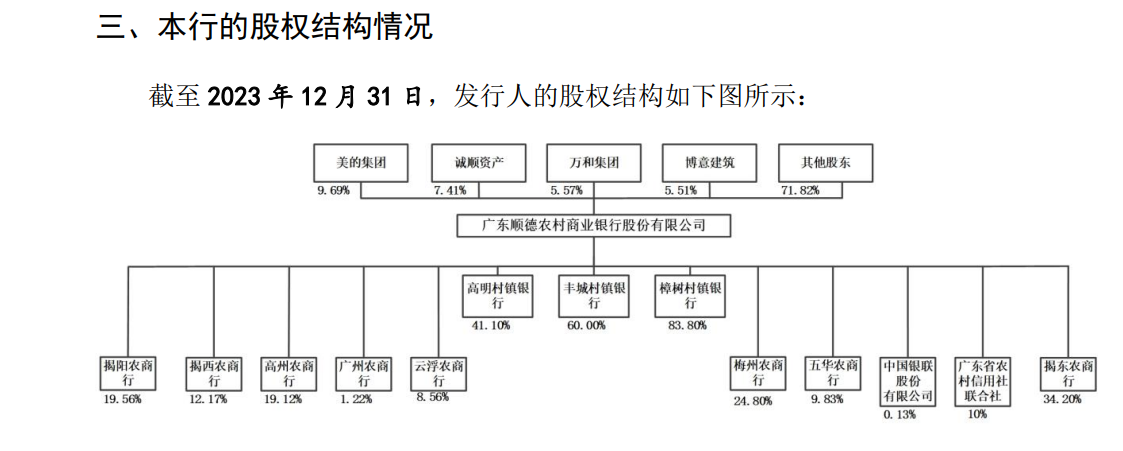 截至2023年12月31日,顺德农商行无控股股东或者实际控制人,持有顺德农商行5%以上股份股东包括:美的集团持股9.69%、诚顺资产7.41%、万和集团5.57%、博意建筑5.51%。