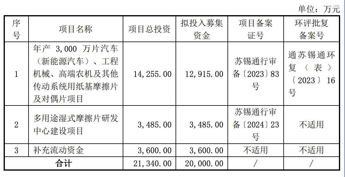 本次IPO,林泰新材拟向不特定合格投资者公开发行不超过585万股股票,募资2亿元。募集资金在扣除发行费用后拟投入:年产3000万片汽车(新能源汽车)、工程机械、高端农机及其他传动系统用纸基摩擦片及对偶片项目;多用途湿式摩擦片研发中心建设项目;补充流动资金。