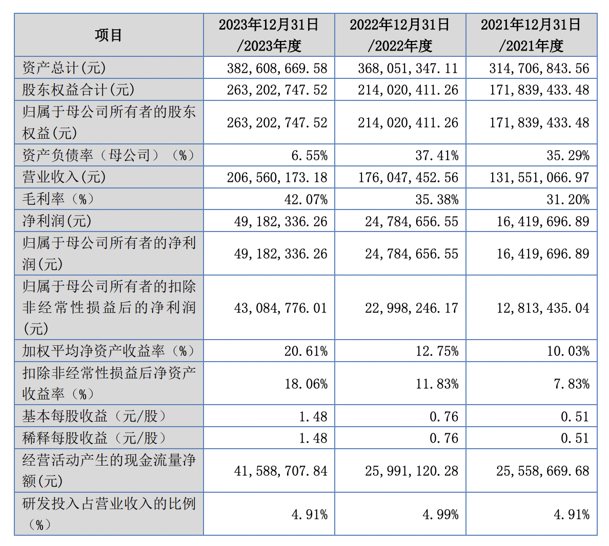 业绩方面,2021年-2023年,林泰新材营业收入分别为1.32亿元、1.76亿元及2.07亿元,净利润分别为1641.97万元、2478.47万元及4918.23万元,毛利率分别为31.2%、35.38%和42.07%。