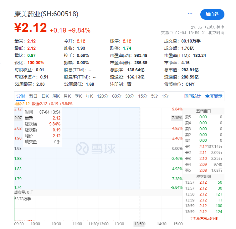 瑞财经 李兰 7月4日,康美药业复牌一字涨停,截至13:59,报2.12元,总市值为293.91亿元。