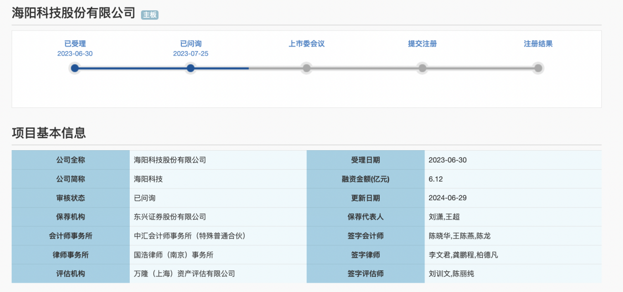据瑞财经查阅,海阳科技IPO于2023年6月30日获北交所受理,保荐机构为东兴证券股份有限公司,保荐代表人为刘潇、王超,会计师事务所为中汇会计师事务所(特殊普通合伙)。