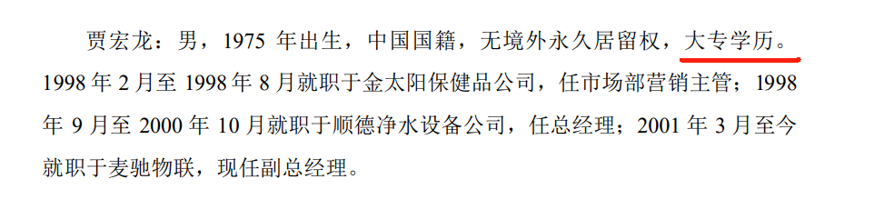 贾宏龙,1975年出生,大专学历。1998年2月至1998年8月就职于金太阳保健品公司,任市场部营销主管;1998年9月至2000年10月就职于顺德净水设备公司,任总经理;2001年3月至今就职于麦驰物联,现任副总经理。