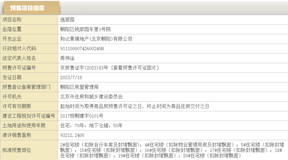 据北京市住建委官网,御翠园位于北京市朝阳区姚家园东里1号院,2023年7月18日获得预售证,预售范围包括9栋住宅合计473套房源,准许销售面积约9.32万m²,其中77套别墅,396套普通住宅,拟售均价在9.07万元-9.97万元/m²区间。