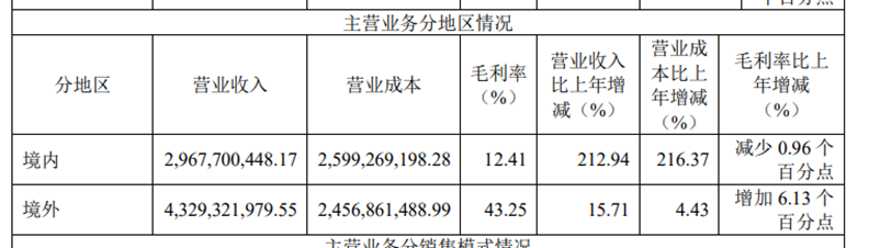 期内,固德威在境外的营收为43.29亿元,同比增长15.71%,在境内的营收为29.68亿元,同比大增212.94%。不过,境内市场的毛利率仅有12.41%,同比减少 0.96 个百分点,而境外市场的毛利率高达43.25%,同比还增加了6.13 个百分点。