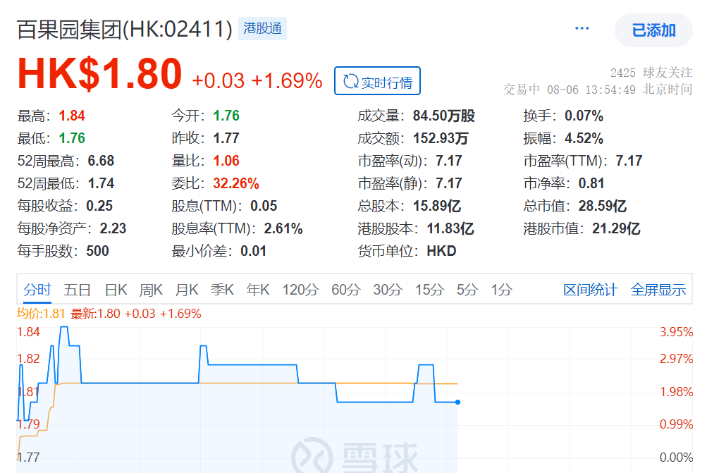 截至8月6日14:05百果园每股报1.80港元,总市值28.59亿港元,年内股价下跌近70%。