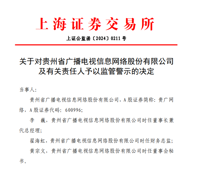 瑞财经 李兰 9月20日,上交所发布关于对贵州省广播电视信息网络股份有限公司(以下简称“贵广网络”)及时任董事长兼代总经理李巍、时任董事会秘书黄宗文等有关责任人予以监管警示的决定。