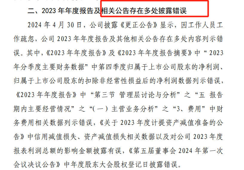 2024年4月30日,贵广网络披露《更正公告》显示,因工作人员工作疏忽,贵广网络2023年年度报告及其他相关公告存在多处内容列示错误。