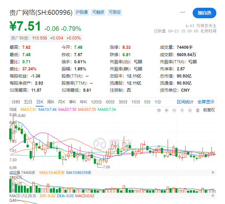 截至9月23日收盘,贵广网络(600996.SH)股价跌0.79%,报7.51元,总市值为90.93亿元。