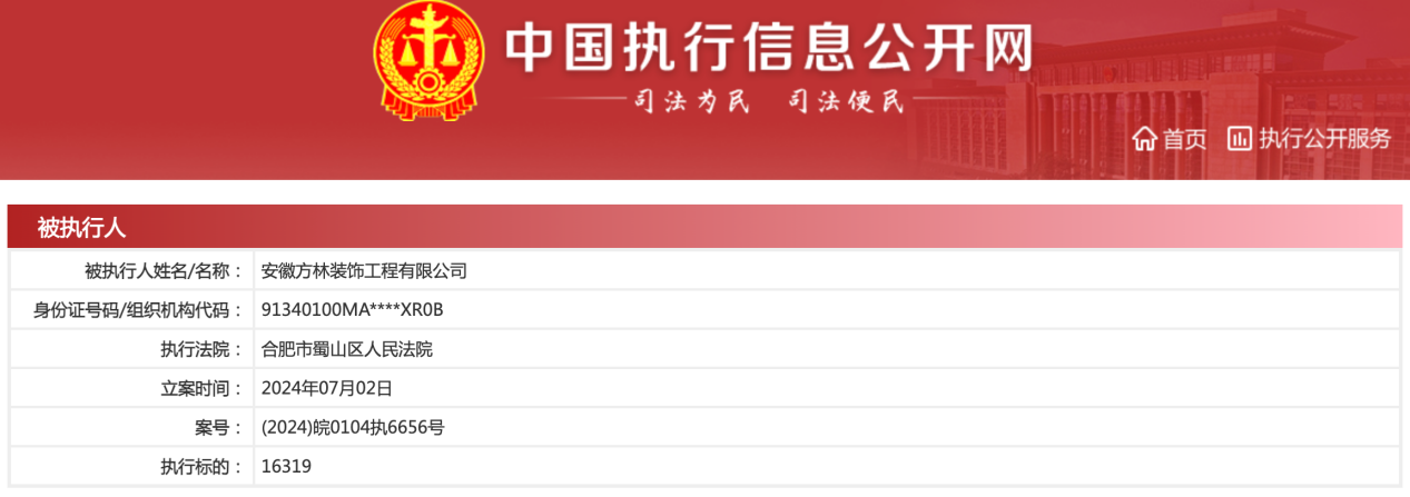 不仅如此,方林装饰的分公司还显示出一定的经营风险。在近期7月2日,安徽方林装饰工程有限公司成为被执行人,执行法院未合肥市蜀山区人民法院,案号为(2024)皖0104执6656号,执行标的仅1.6万元。