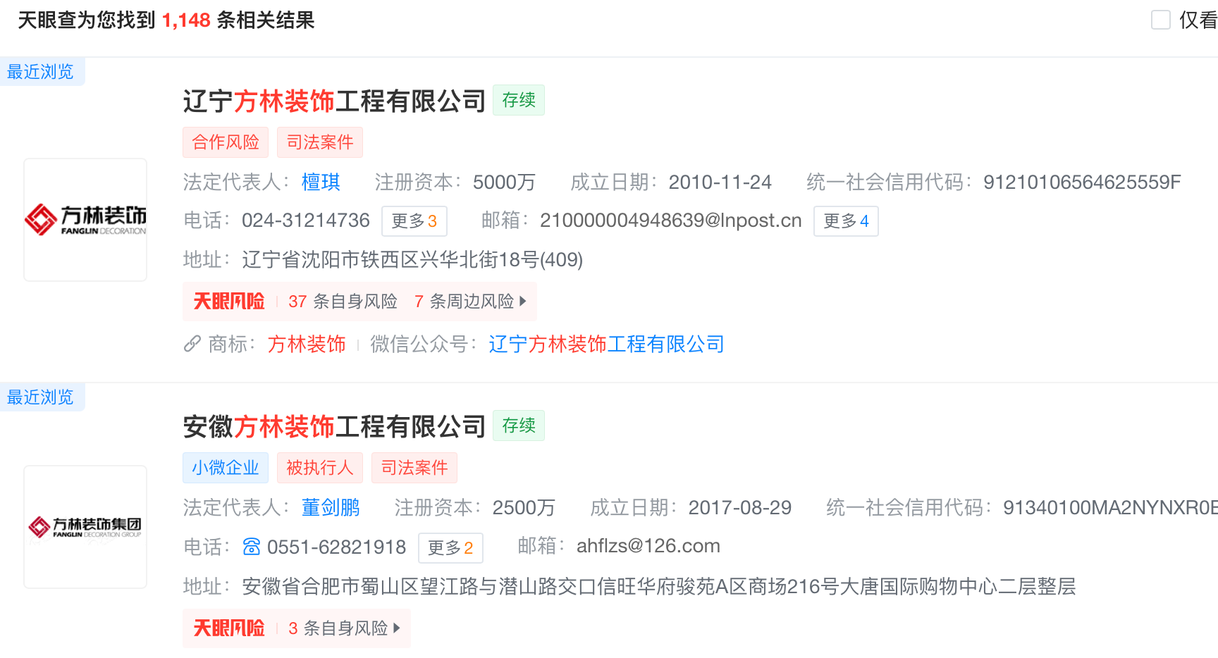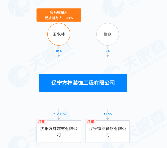 辽宁方林装饰工程有限公司是这几家公司中成立最早的一家,也一度被认为是方林装饰的主体公司,从股权架构来看,该公司曾对外投资2家子公司,分别是“沈阳方林建材有限公司”和“辽宁徽韵餐饮有限公司”,目前均显示“已注销”。