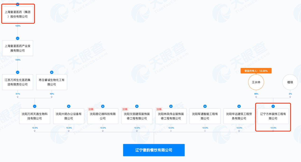 和方林装饰的其他众多分公司不同,辽宁徽韵餐饮是由王水林亲自担任法定代表人,该公司由8家公司分别持股12.5%,其中包括方林装饰,还包括上海复星医药集团旗下的子公司,王水林则是该公司的最终受益人,持股比例12.25%。