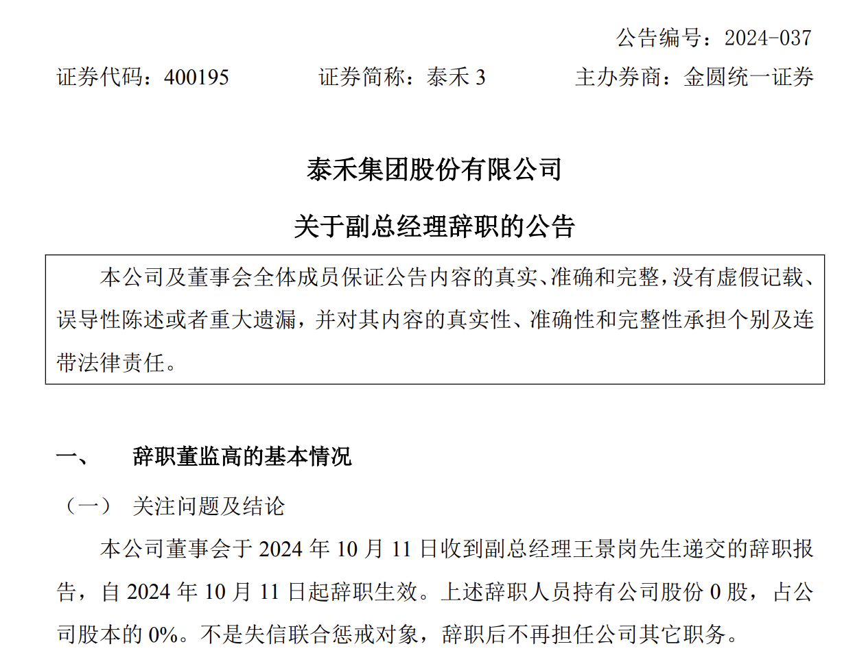 乐居财经 徐迪 10月14日,泰禾集团股份有限公司公告,董事会于2024年10月11日收到副总经理王景岗递交的辞职报告,王景岗因身体原因,辞去泰禾集团副总经理职务。