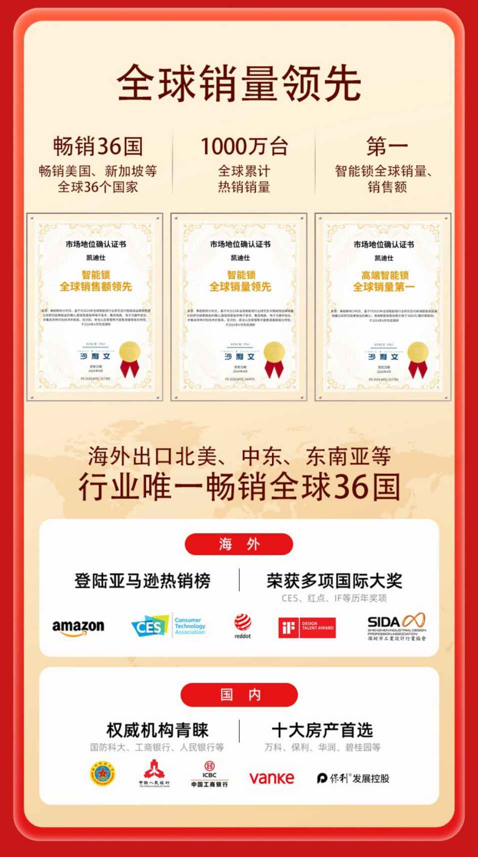 近年来,凯迪仕已经逐步建立起了高于外部标准的企业标准,充分展现了技术自信和标准自信,产品畅销36国,全球累计热销超1000万台。作为全自动智能锁首创者,凯迪仕自研的神盾智能安全系统和磐石锁体,成功应用在高端旗舰产品传奇大师K70系列上,广受行业认可和消费者好评。国民爆款Q20F Pro等为代表的一系列热销产品,同样也凭借自身的高标准品质,在2024年618和双11期间受到全渠道消费者的喜爱,登上京东、天猫、抖音等平台多个榜单TOP 1。