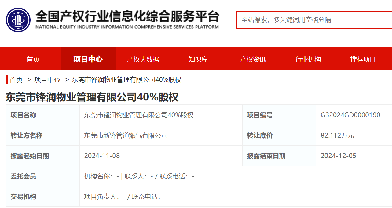 乐居财经 王敏 11月8日,据全国产权交易中心,东莞市锋润物业管理有限公司40%股权挂牌转让,转让底价82.112万元,转让方为东莞市新锋管道燃气有限公司,转让起止时间为2024年11月8日至2024年12月5日。