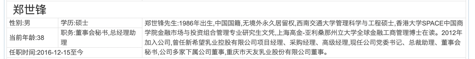 郑世锋2012年加入新乳业,曾任新希望乳业控股有限公司项目经理、采购经理、高级经理,2016年12月起任新乳业党委书记、总裁助理、董事会秘书,身兼多职。并且他还兼任新乳业多家下属公司董事,重庆市天友乳业股份有限公司董事。