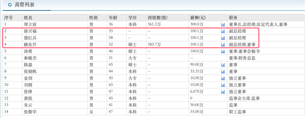 瑞财经留意到,除董事长周立宸外,公司高管团队的年龄普遍在50岁上下。三名副总裁分别为:55岁的徐兴福、58岁的强红兵,以及52岁的顾东升。