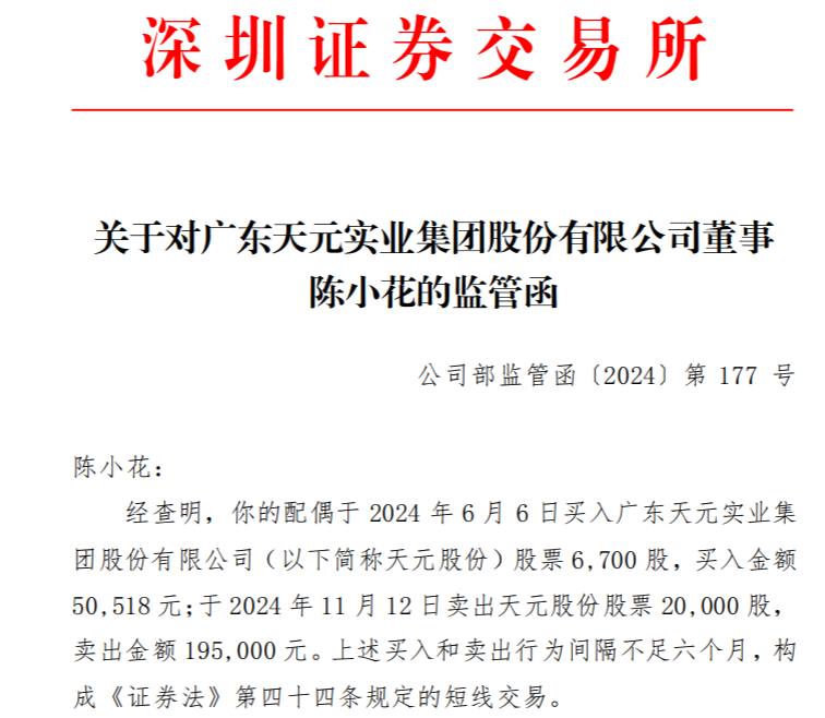 天元股份副总经理兼财务总监陈小花收监管函,因配偶买卖公司股票构成短线交易