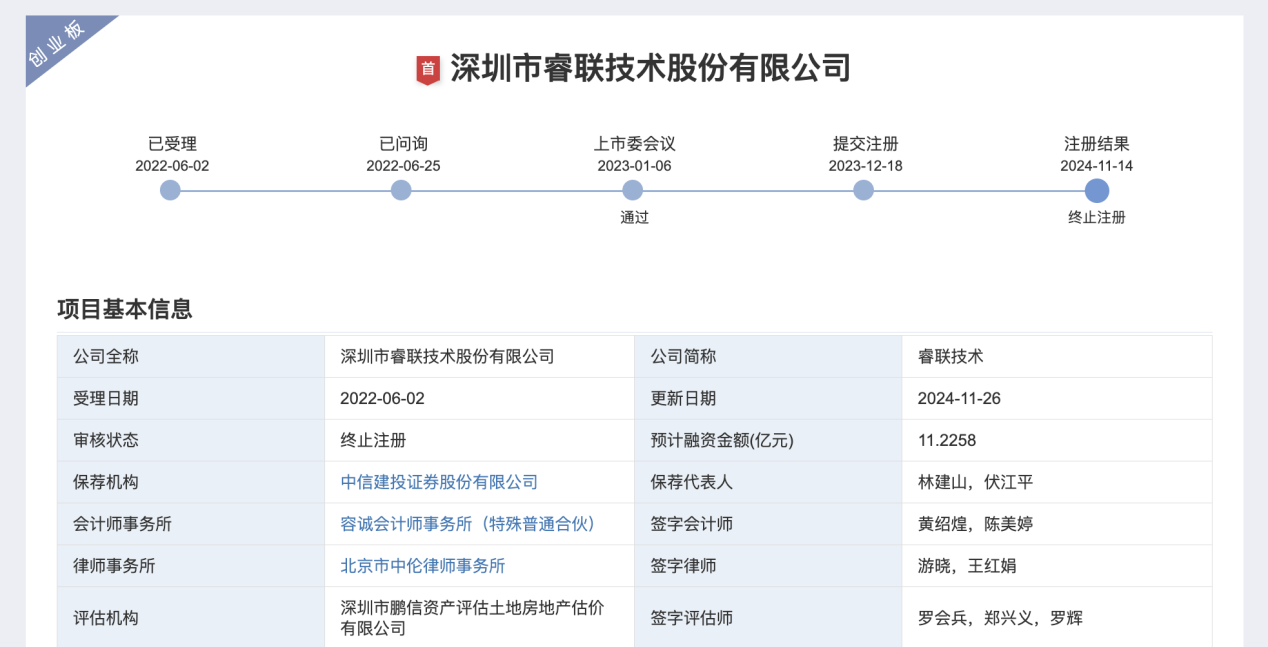 瑞财经 刘治颖 11月14日,深圳市睿联技术股份有限公司(以下简称:睿联技术)深交所IPO终止注册,保荐机构为中信建投证券股份有限公司,保荐代表人为林建山、伏江平,会计师事务所为容诚会计师事务所(特殊普通合伙)。