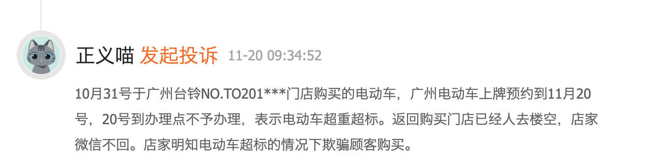 瑞财经 刘治颖 11月20日,据黑猫投诉官网显示,台铃电动车因超重超标无法上牌遭消费者投诉。
