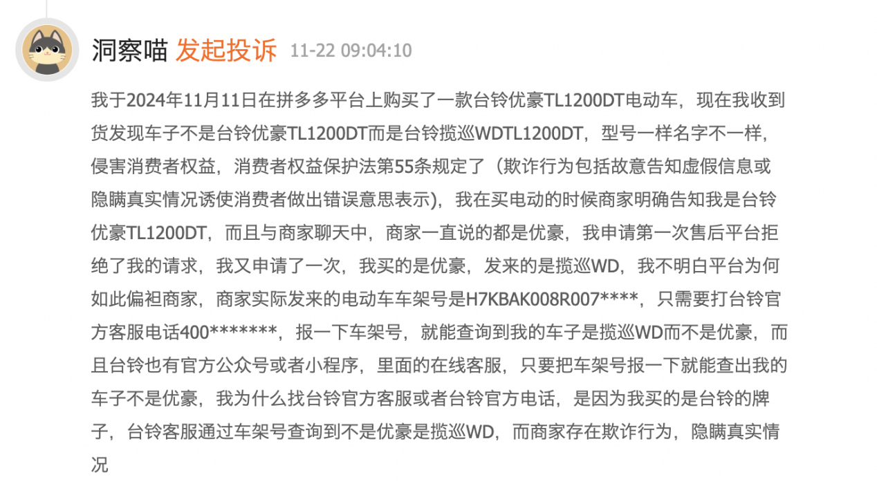11月22日,一名消费者称,11月11日在拼多多平台上购买了一款台铃优豪TL1200DT电动车,收到货发现车子不是台铃优豪TL1200DT而是台铃揽巡WDTL1200DT,型号一样名字不一样。