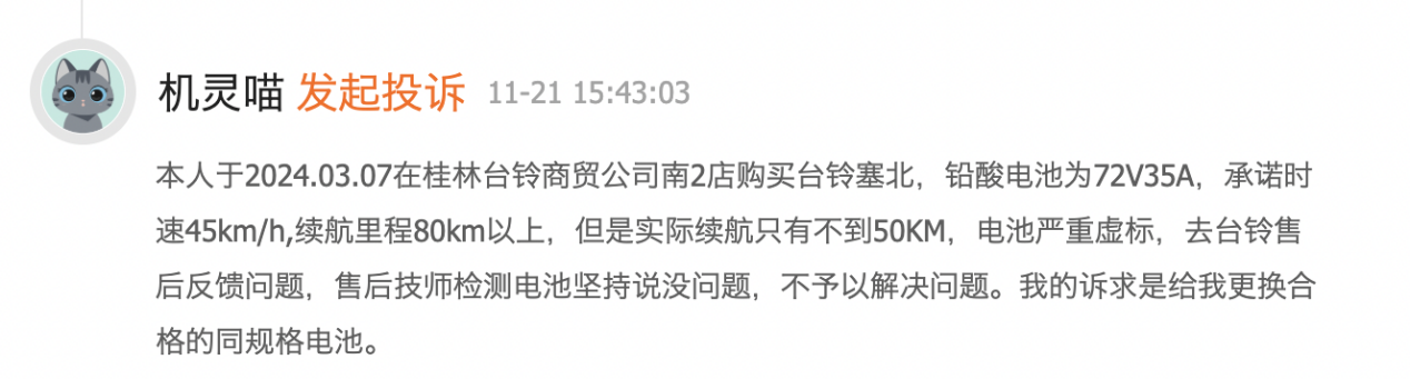 11月21日,一名消费者称,2024年3月购买台铃塞北,铅酸电池为72V35A,承诺时速45km/h,续航里程80km以上,但实际续航不到50KM,电池严重虚标,去台铃售后反馈问题,售后技师检测电池坚持说没问题,不予以解决问题。