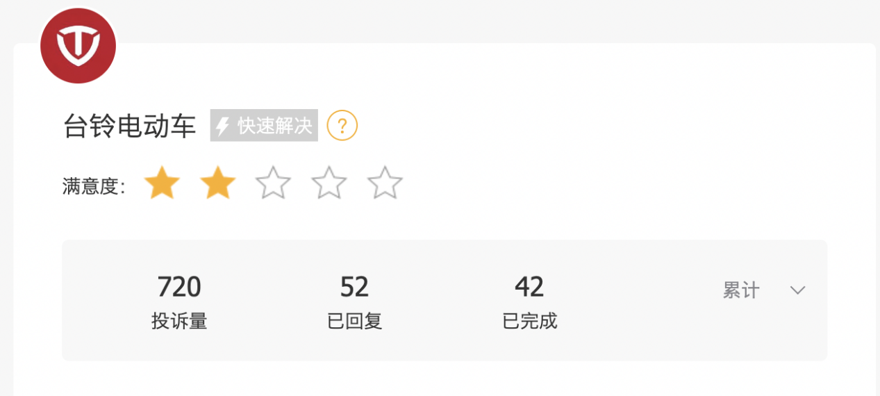 据瑞财经查阅,台铃电动车累计投诉量为720条,已完成42条,已回复52条,平均投诉完成率仅5.8%。